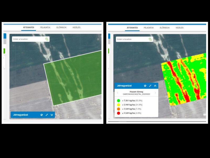 Két kombájn hozamtérképéből (automatikusan) egyesített hozamtérkép, mely látványosan visszaadja a homokos foltok gyenge terméspotenciálját