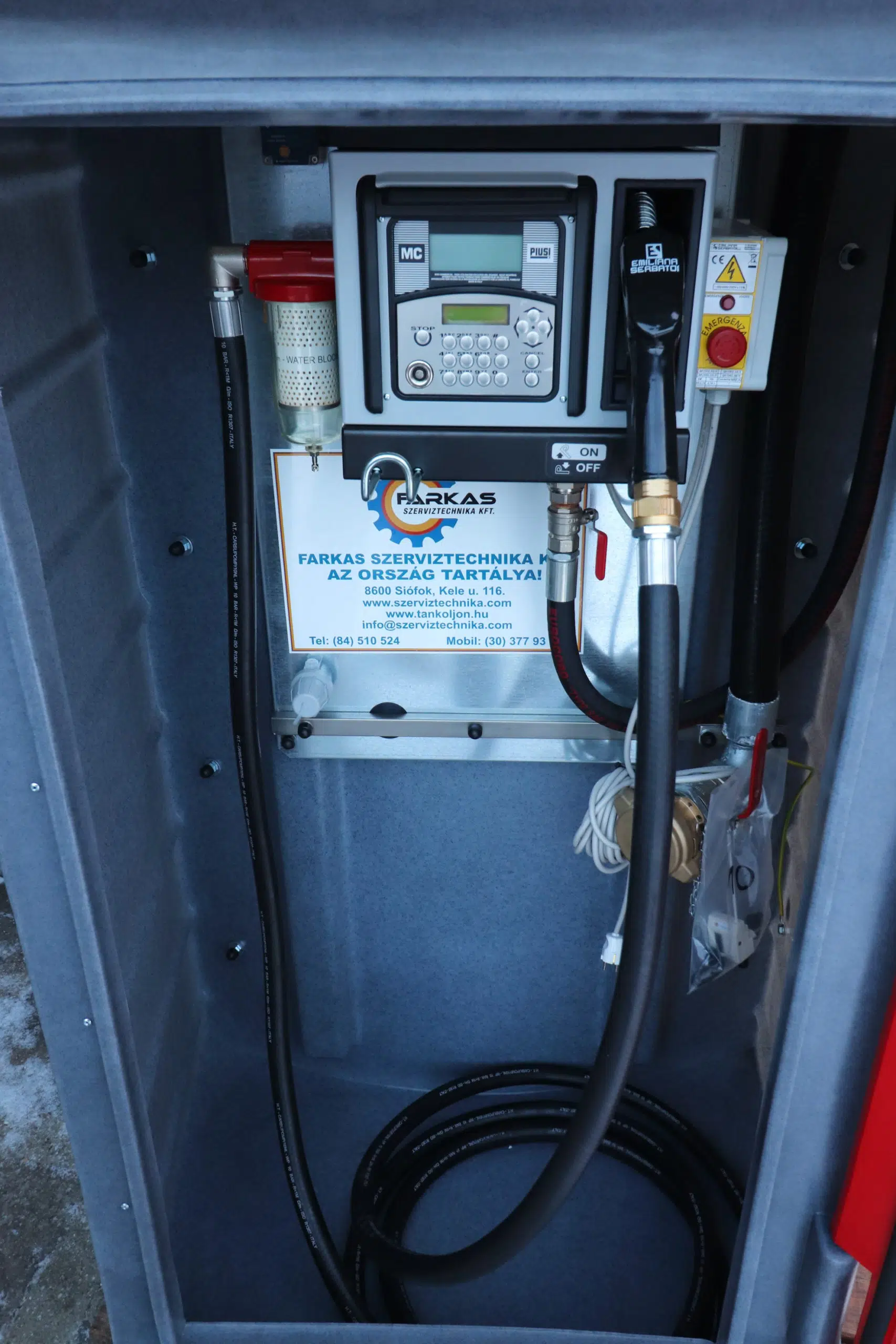 Duplafalú 7 500 l műanyag gázolajtartály 2 ponton zárható kimérő szekrénnyel, front töltéssel. CUBE MC 70 digitális tankolóautomatával, 6 m nyomótömlővel, szűrőkészlettel.A60 automata piasztollyal. UV álló erősített burkolat. Rádiós szintjelző. NA 600 (24") dómfedél, . VK 80-as 3" csatlakozással