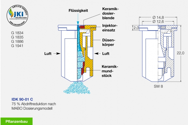 A kerámia betétnek köszönhetően, az IDK 90 C permetező fúvóka kopásállóbb, tartósabb mint a műanyag kivitel.